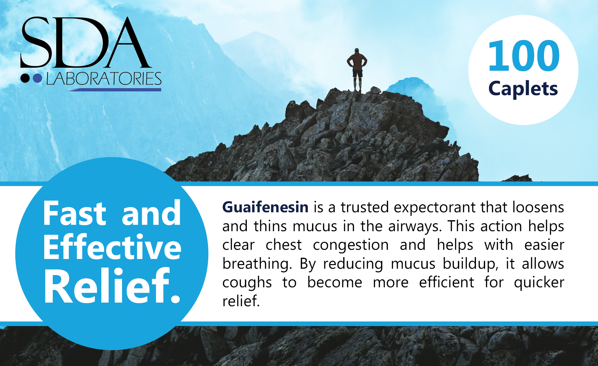 SAFE, TRUSTED FORMULA FOR EVERYDAY USE: SDA Laboratories’ guaifenesin formulation is a widely used and generally well-tolerated option for temporary congestion relief. When taken as directed, side effects are minimal and hydration enhances its effectiveness. Its OTC availability makes it an accessible solution for seasonal colds, mild bronchitis, or respiratory discomfort.